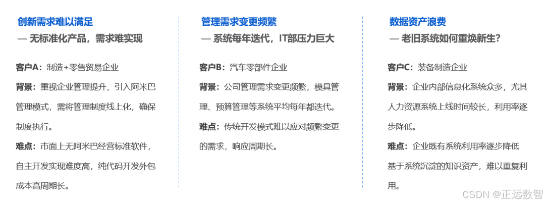 如正远低代码的一家零售业客户,希望引入阿米巴经营模式,但市场上没有标准软件,自主开发成本高、周期长;另一家汽车零部件客户,其研发管理、预算管理等核心系统每年都需要迭代,传统开发模式响应迟缓,让IT部门不堪重负。这种技术刚性使得企业无法快速响应管理创新,难以进行业务试错,大量宝贵的知识和经验被禁锢在老旧系统中,无法转化为竞争优势。