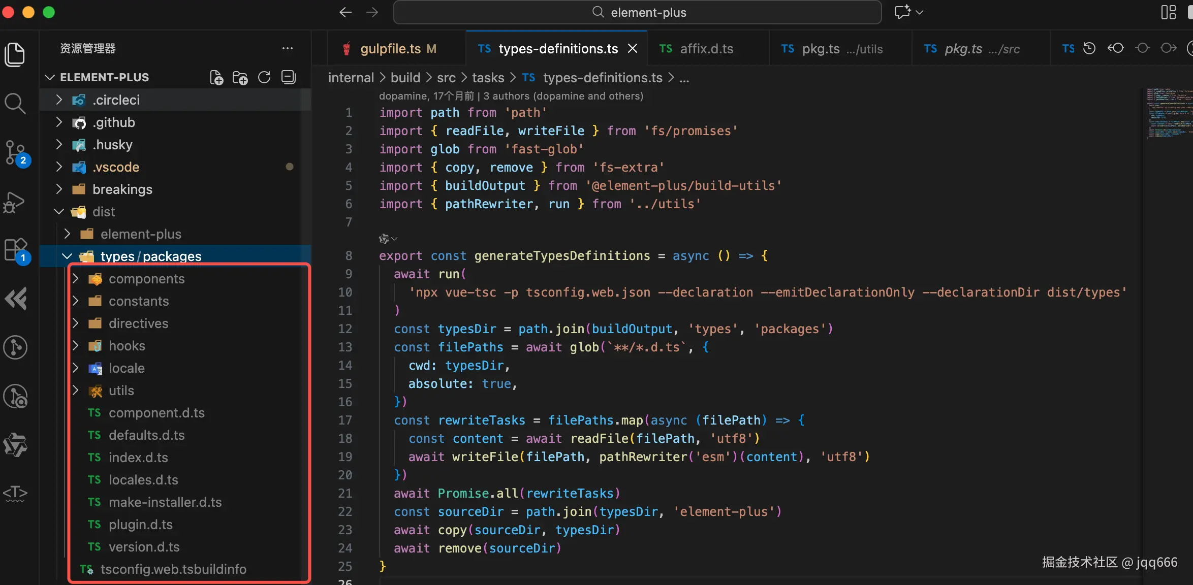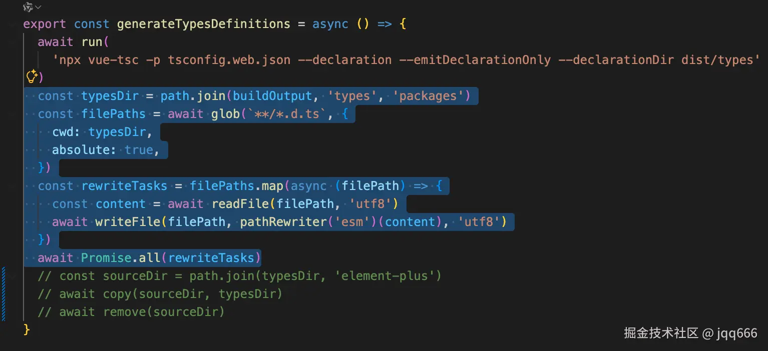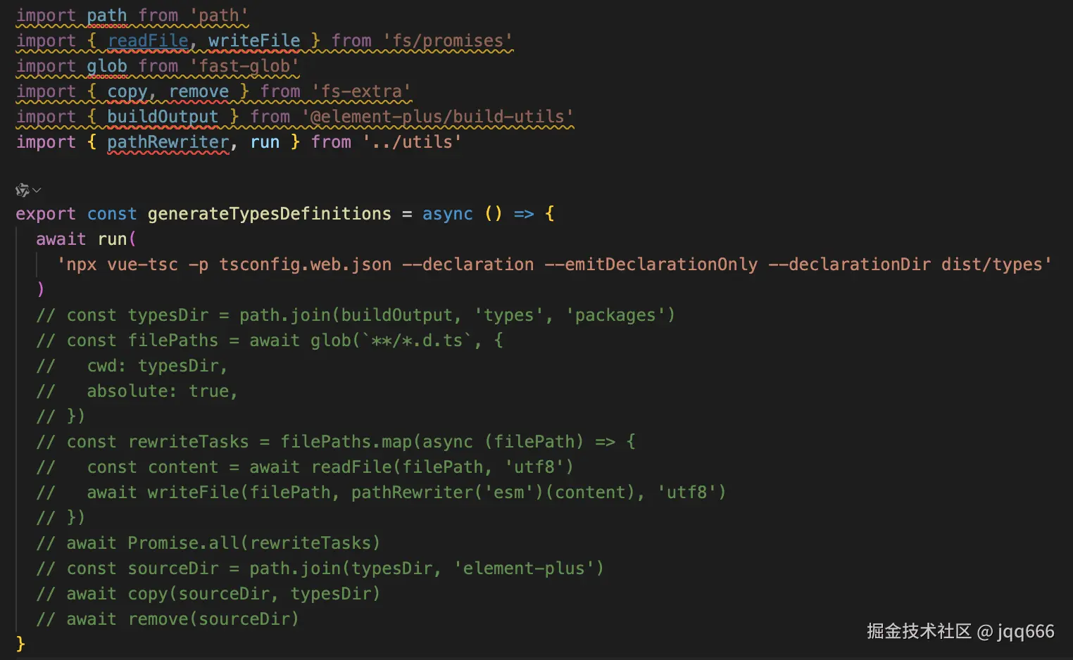 可以看到这里import的是es文件目录下的类型文件,之前打包的es下面并没有对应的类型啊???其实后面还有处理,会把types的相关类型移动到对应目录下,需要往后面看 copyTypesDefinitions