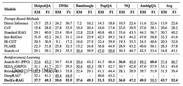 DecEx-RAG 拿下了最好成绩,平均 EM 43.7、F1 52.4,在所有基线中领先。