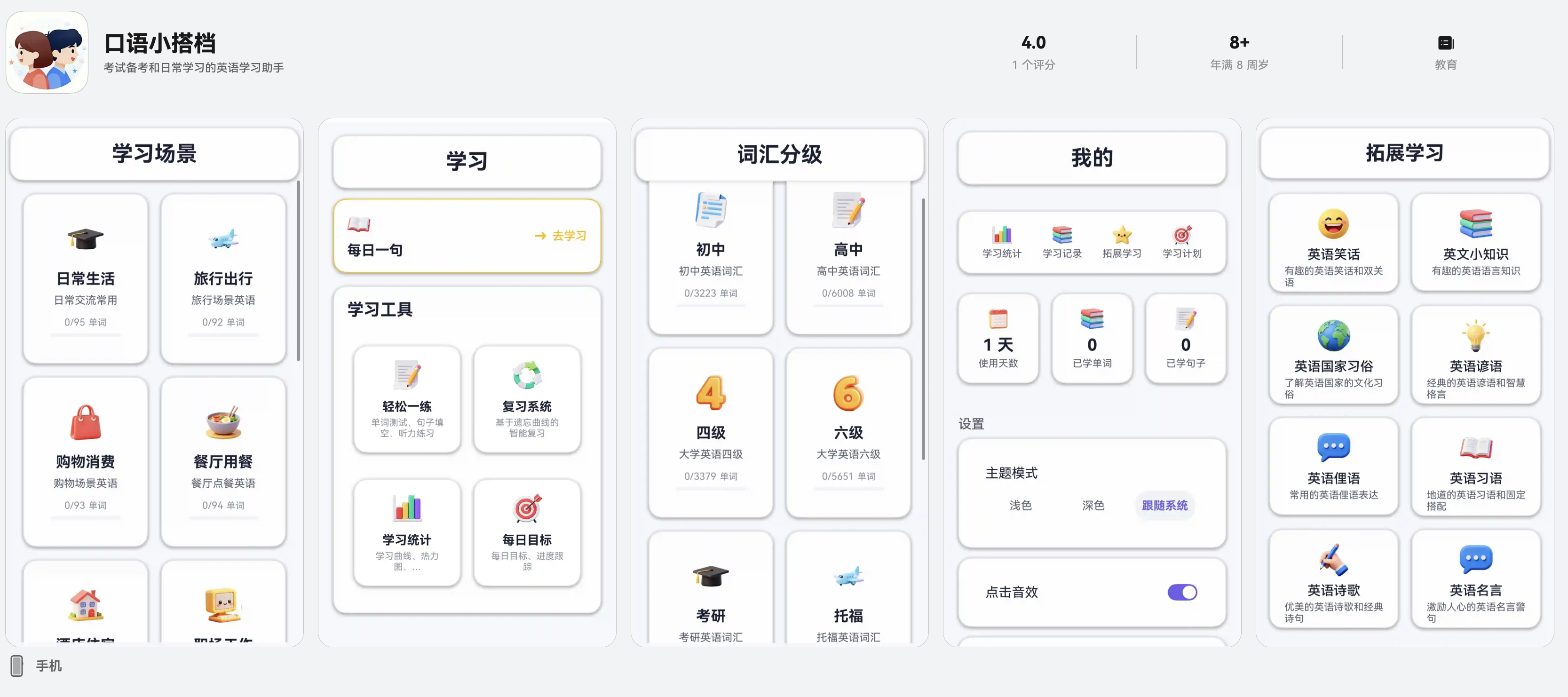 口语小搭档是一款面向日常学习和考试备考的英语学习 App,主打「分级 + 场景 + 练习 + 复习」一体化。