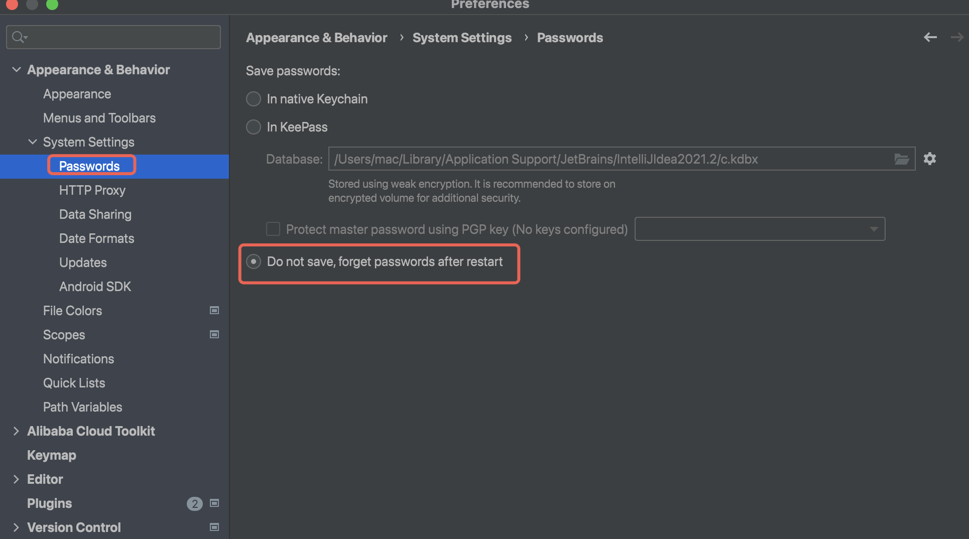 二、再次找到IntelliJ IDEA -> settings -> Appearance & Behavior -> System Settings 找到 Passwords 在里面找到 Do not ,forget passwords after restart 选择这个