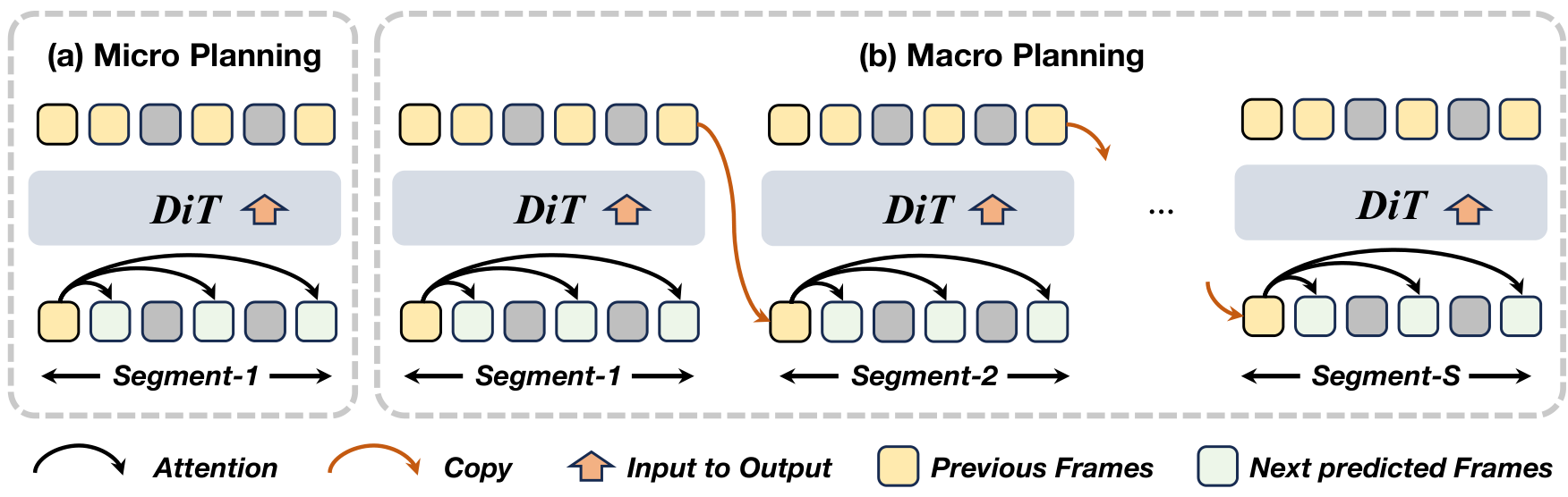 其中, M s \mathcal{M}_{s} Ms 是片段 s s s 的微观规划。通过分层链接片段,宏观规划将逐帧自回归依赖转换为稀疏的片段级规划步骤序列。这确保了全局叙事流的一致性,减轻了时间漂移,并将误差累积从 T T T 帧的尺度减少到仅 S S S 个片段的尺度,其中 S ≪ T S \ll T S≪T。