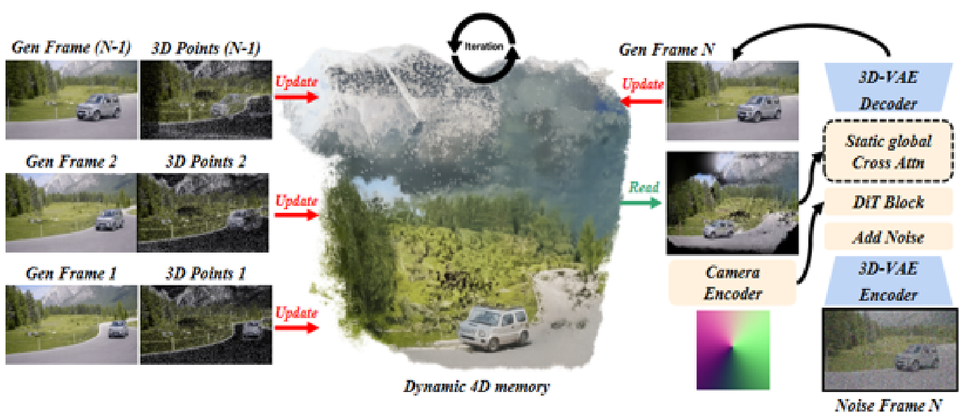 我们引入了一个动态的"生成-重建-引导"闭环框架,用于统一的4D时空建模。该框架构建了一个实时、原生的4D世界表示,随着每个新生成的视频片段持续更新,确保与不断演进的视觉内容完美同步。