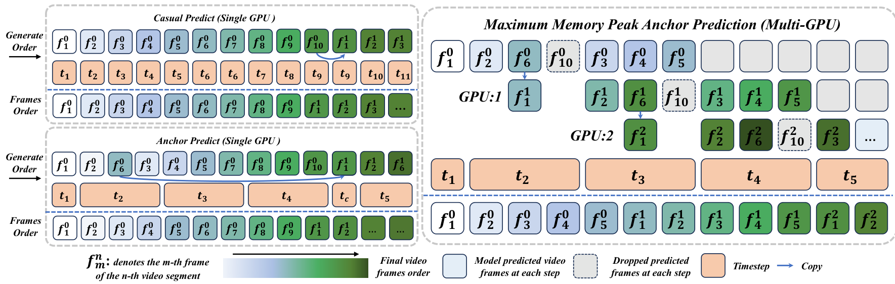 Figure 4 Multi-GPU parallel inference via adaptive workload scheduling. Given the initial frame f 1 0 f_{1}^{0} f10 , segment 0 first generates its planning frames f 2 0 f_{2}^{0} f20 , f 6 0 f_{6}^{0} f60 , and f 10 0 f_{10}^{0} f100 . These planning frames then guide the content population of the intermediate frames f 3 0 f_{3}^{0} f30 , f 4 0 f_{4}^{0} f40 , and f 5 0 f_{5}^{0} f50 . While segment 0 is still populating these frames, segment 1 can immediately start its Micro Planning by taking f 10 0 f_{10}^{0} f100 as the initial frame f 1 1 f_{1}^{1} f11 and generating its own planning frames f 2 1 f_{2}^{1} f21 , f 6 1 f_{6}^{1} f61 , and f 10 1 f_{10}^{1} f101 . This staged execution enables overlapping planning and populating across segments, maximizing multi-GPU parallelism. Here, each t i t_{i} ti denotes an inference step in the diffusion sampling process.