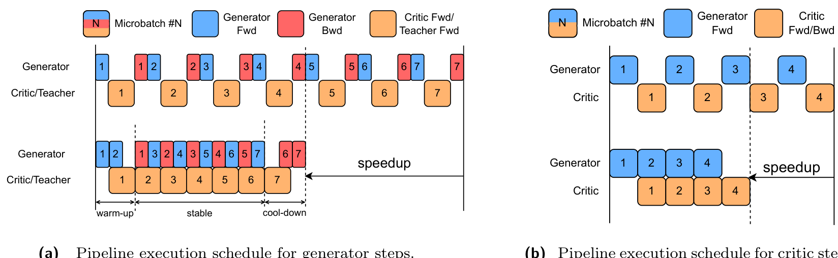 Figure 3 Pipeline execution schedules for Distribution-Matching Distillation. (a) Generator-step pipeline with 7 micro-batches. Cell length denotes execution time. The critic and teacher works in parallel, so their cells are merged together for simplicity, and their cell length denotes the maximum of their execution time. The upper half of the figure is the non-pipelining baseline, which introduces a lot of GPU bubbles (i.e. GPU idle time). The lower half is our proposed pipeline schedule. In the stable phase, the generator backward stage of micro-batch i i i and the generator forward stage of micro-batch i + 2 i + 2 i+2 are executed concurrently with the critic/teacher forward stage of micro-batch i + 1 i + 1 i+1 . The execution time of all stages are carefully balanced by allocating appropriate numbers of GPUs to each component, enabling near-perfect overlap. This method minimizes GPU bubbles and achieves efficient parallelization of generator, teacher, and critic workloads in the proposed system. (b) Critic-step pipeline with 4 micro-batches. Since the generator parameters remain frozen during the critic update, the pipeline follows a simpler producer-consumer execution pattern.