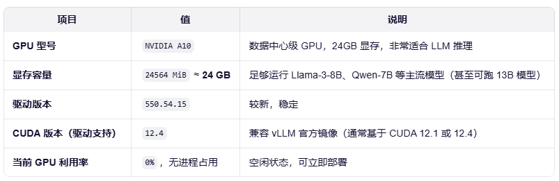- GPU:NVIDIA A10 24GB(✅ 非常适合运行 LLM)