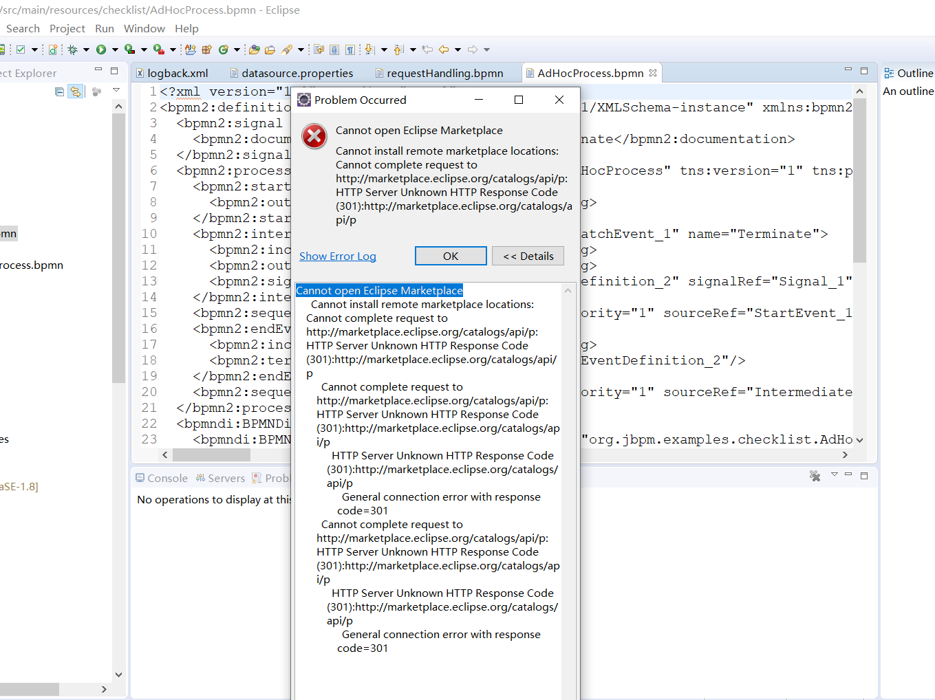 Cannot complete request to http://marketplace.eclipse.org/catalogs/api/p: HTTP Server Unknown HTTP Response Code (301):http://marketplace.eclipse.org/catalogs/api/p
