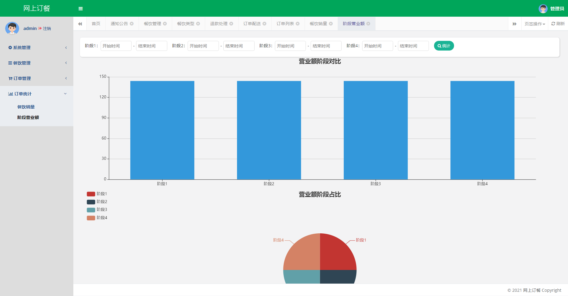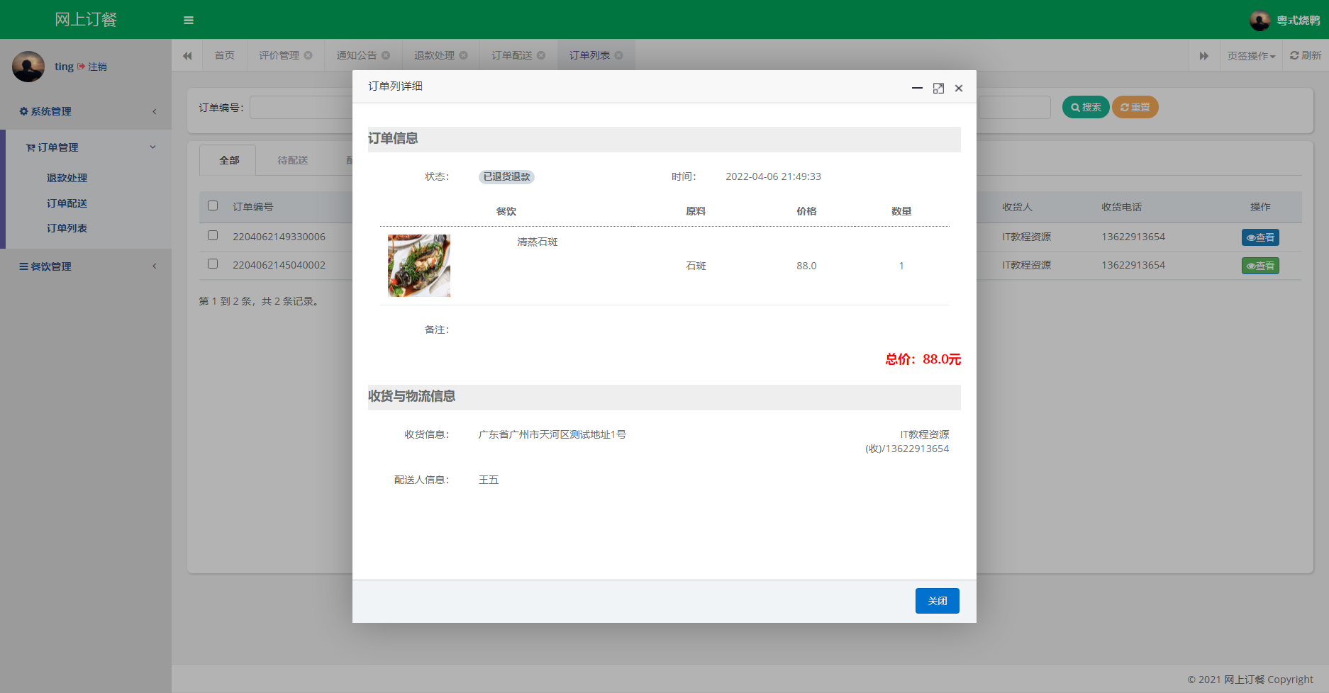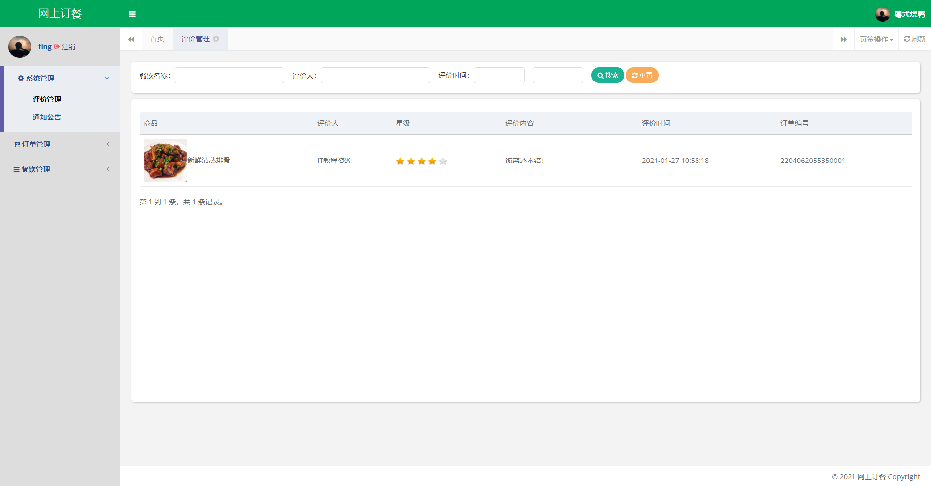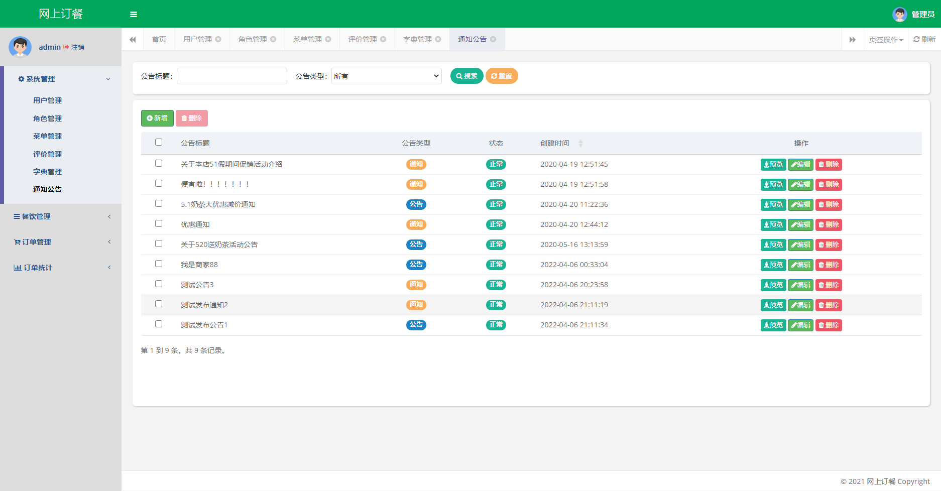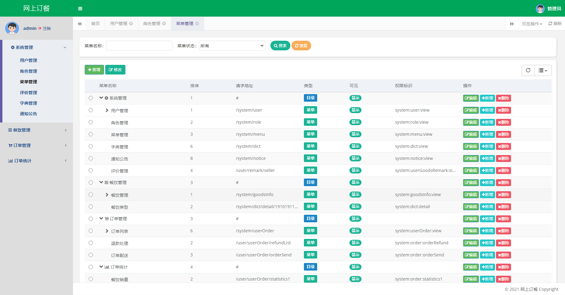 管理员后台:登录、修改密码、修改个人信息、用户管理、角色管理、菜单管理、评价管理、字典管理、通知公告、餐饮管理、订单管理、订单统计、退出登录。