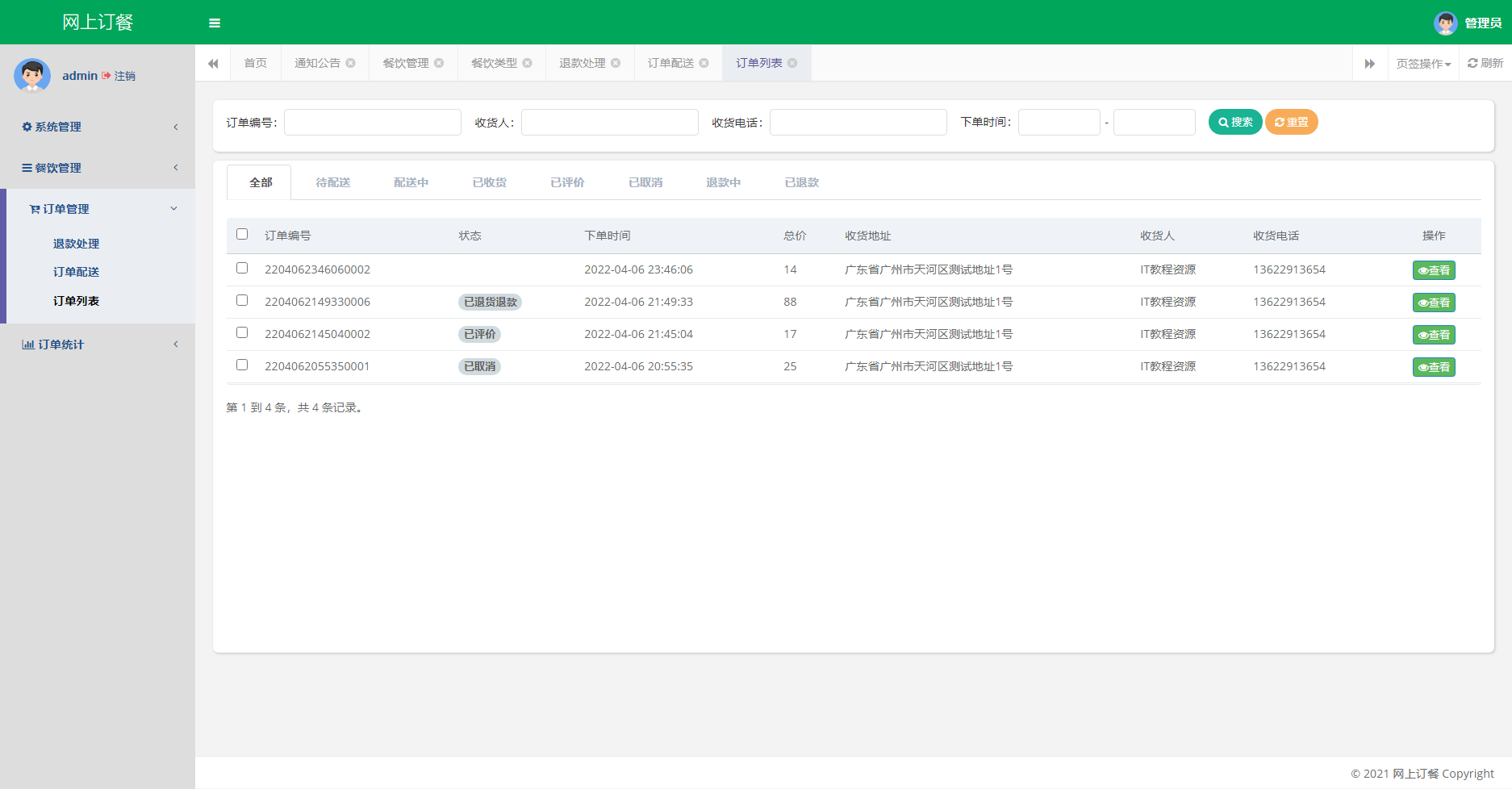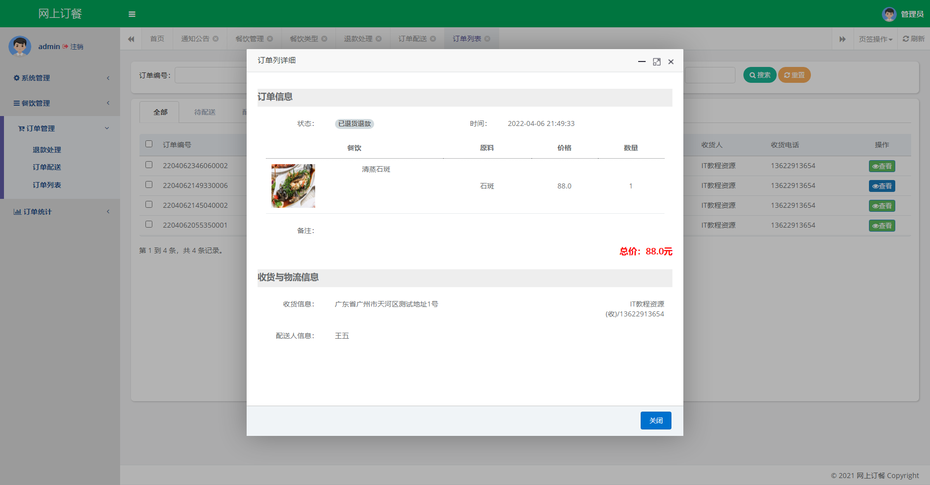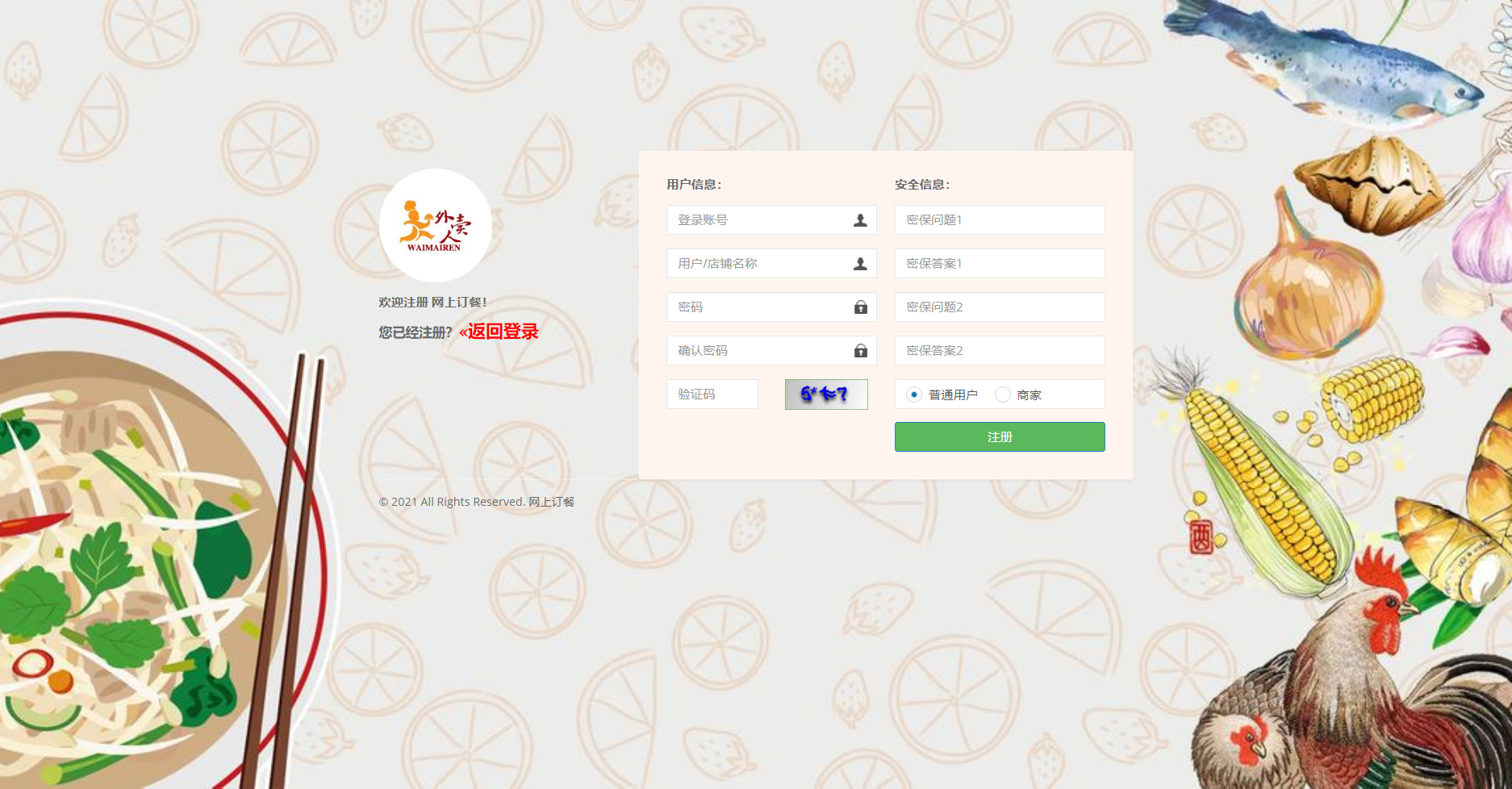 商户后台:登录、注册、修改密码、修改个人信息、系统管理(评价管理、通知公告)、订单管理(退款处理、订单配送、订单列表)、餐饮管理、退出登录。