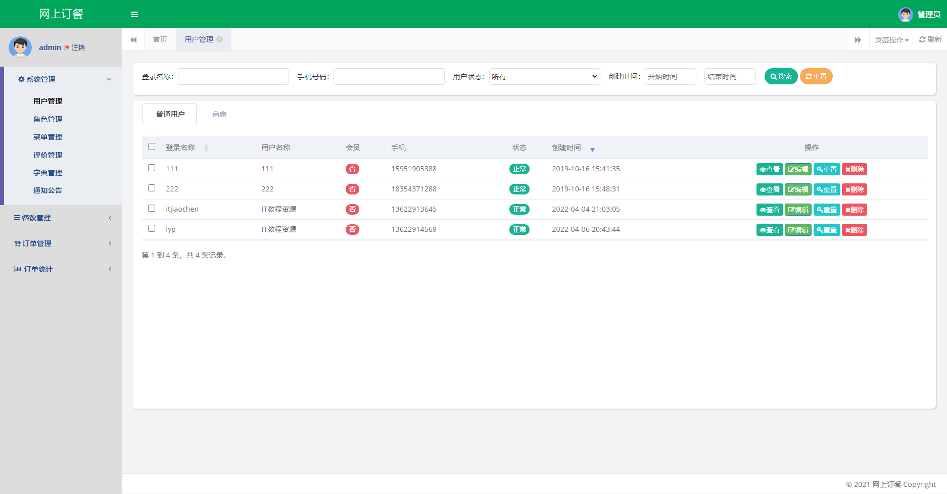 本项目为点餐系统,主要分三个角色:用户、商户、管理员