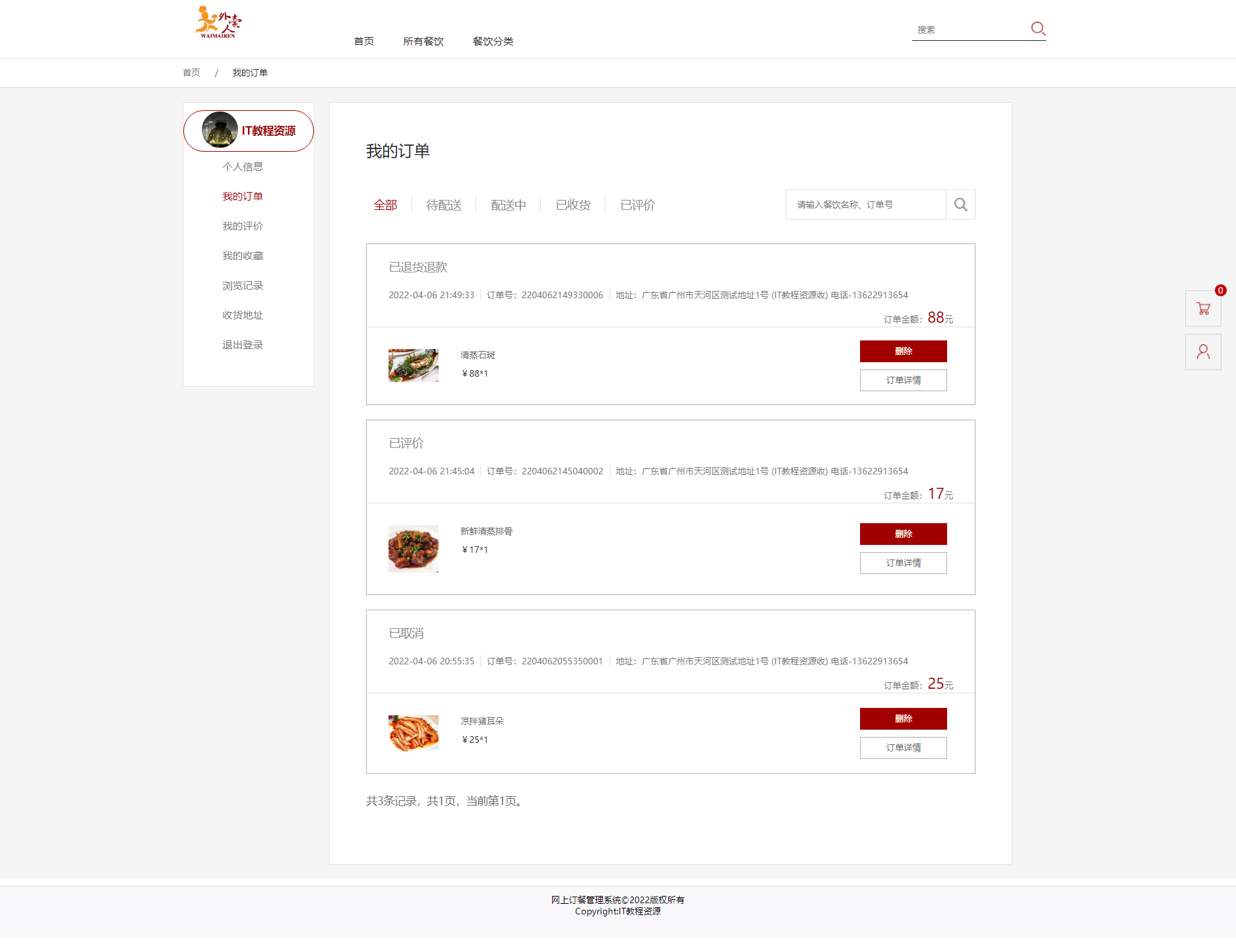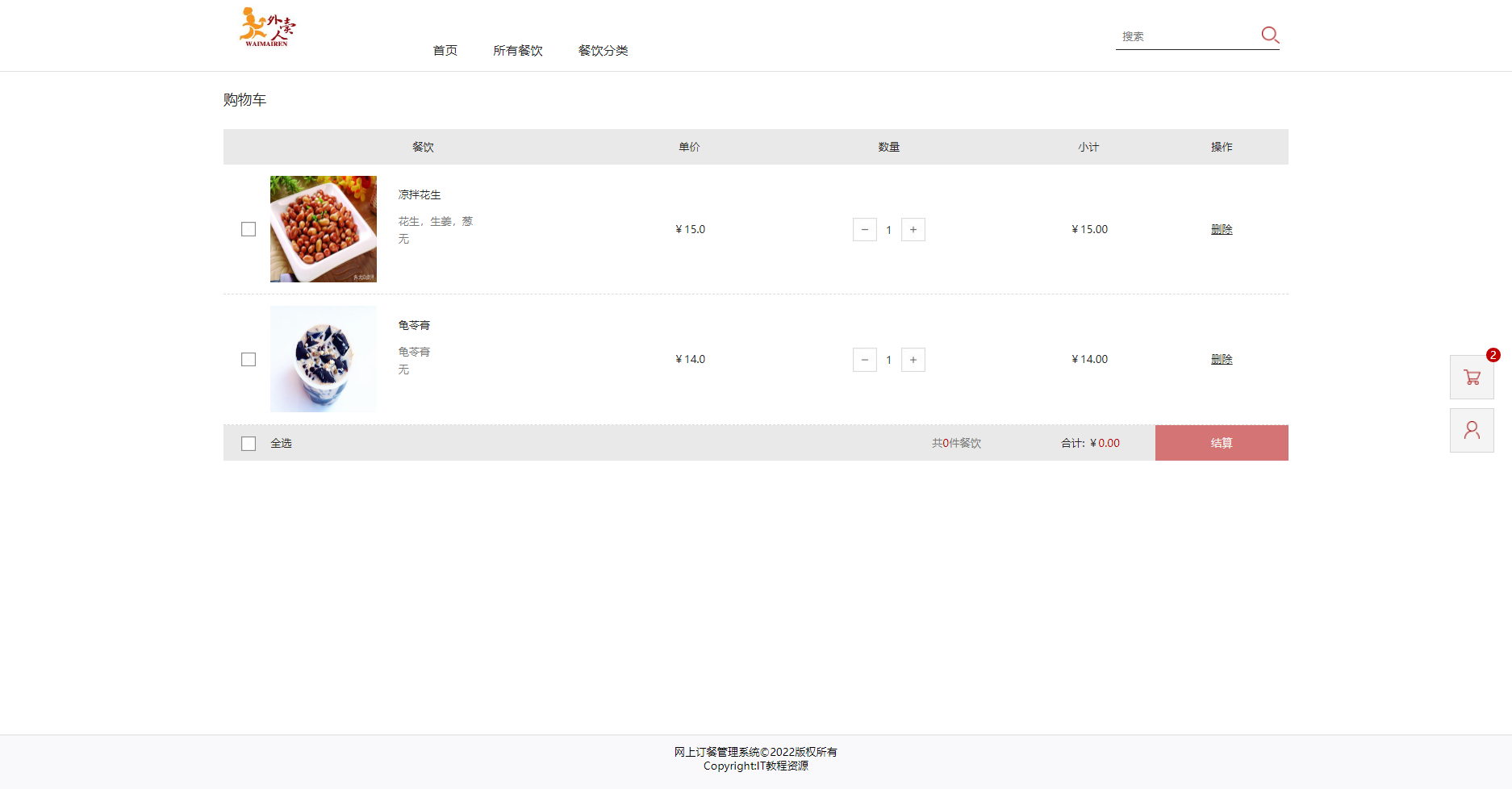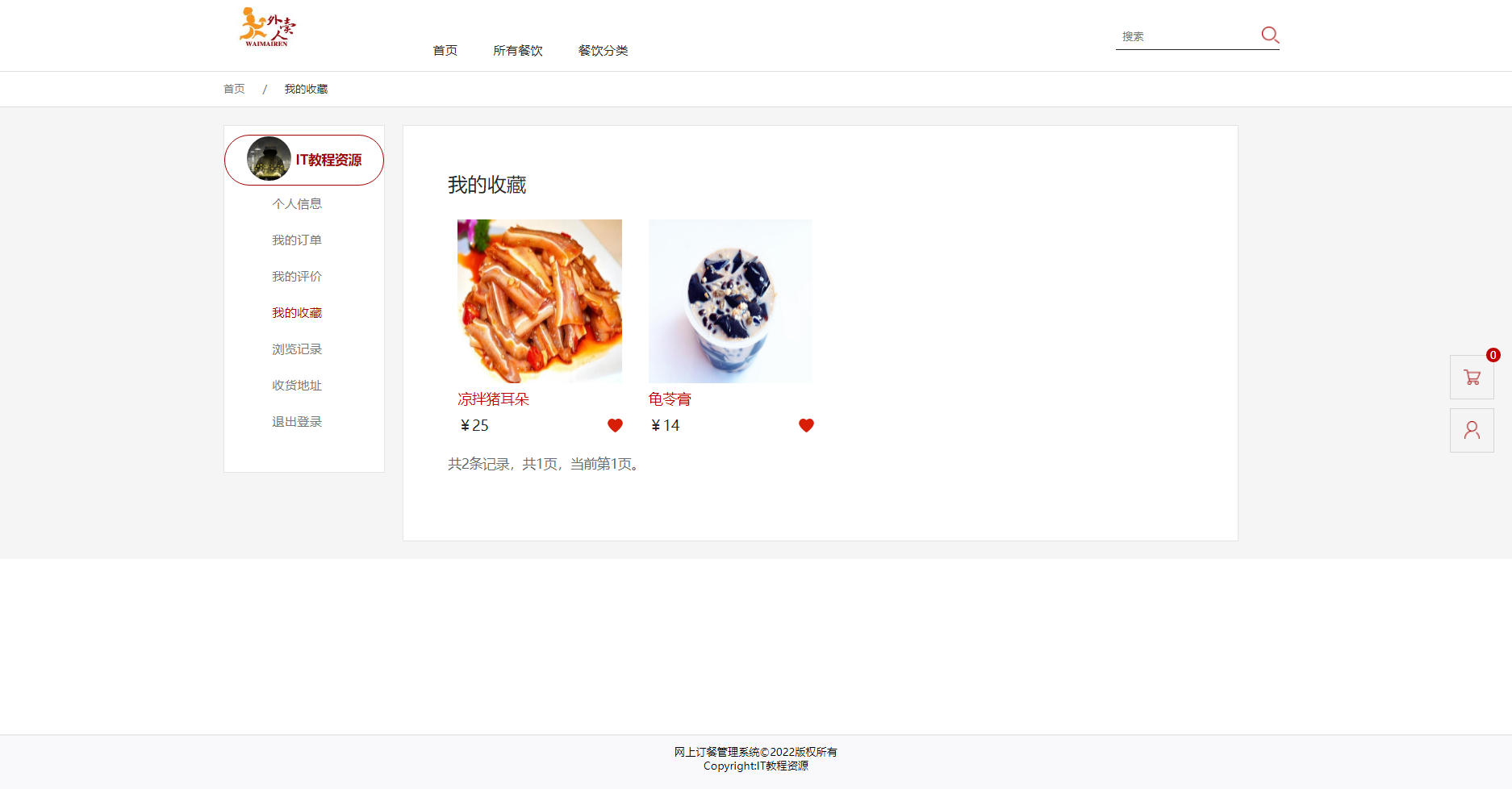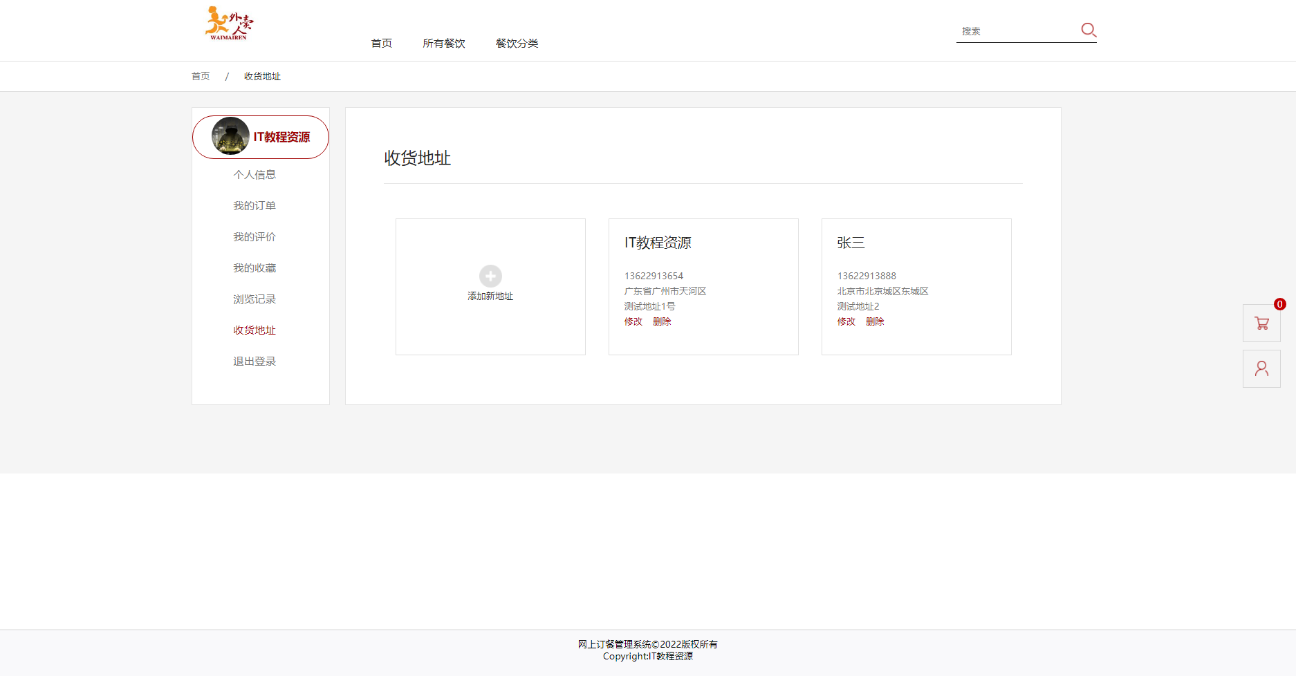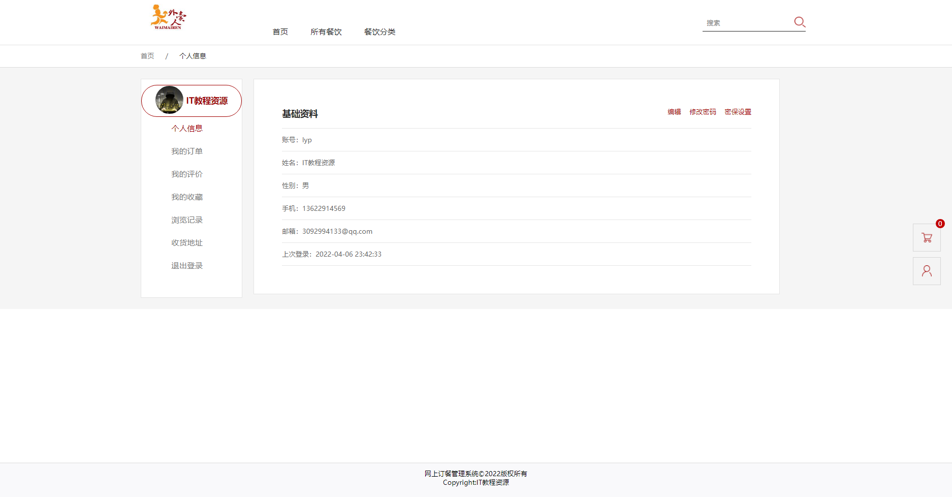 用户前台:实现了登录、注册、菜品浏览、查看详情、加入购物车、生成订单、支付、评价、修改个人信息、修改密码、我的订单、我的评价、我的收藏、浏览记录、收货地址、退出登录等功能。