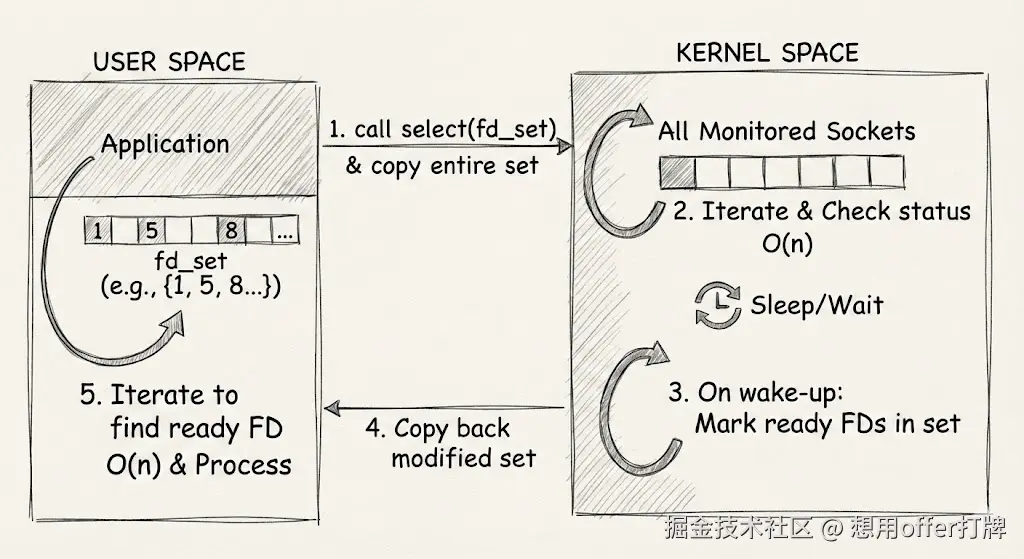 这张图展示了 select 低效的原因:每次调用都需要在用户态和内核态之间拷贝整个文件描述符集合 (fd_set),并且内核和用户程序都需要进行 O(n) 的线性遍历。