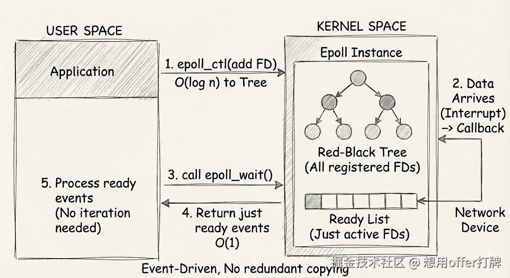 这张图展示了 epoll 高效的原因:它使用红黑树来管理所有的文件描述符(只需注册一次),并采用事件驱动的机制。当网络设备有数据到达时,通过回调函数直接将就绪的 FD 加入到"就绪链表"中,应用程序只需要处理这个链表即可,无需遍历所有连接