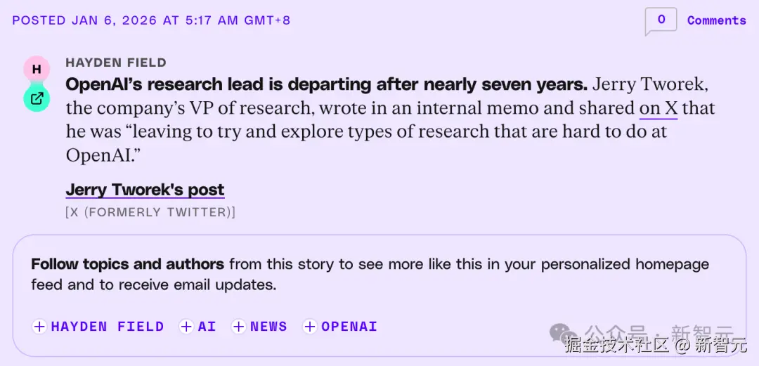 「【新智元导读】新年第一弹,OpenAI 研发副总裁 Jerry Tworek 官宣离职,这位七年老兵给出的理由让人细思恐极:想做在 OpenAI 做不了的研究。从 Dario Amodei 出走创立 Anthropic,到 Ilya 政变后离开,再到安全团队负责人摔门而出------OpenAI 的核心大脑们正在以惊人的速度流失。」