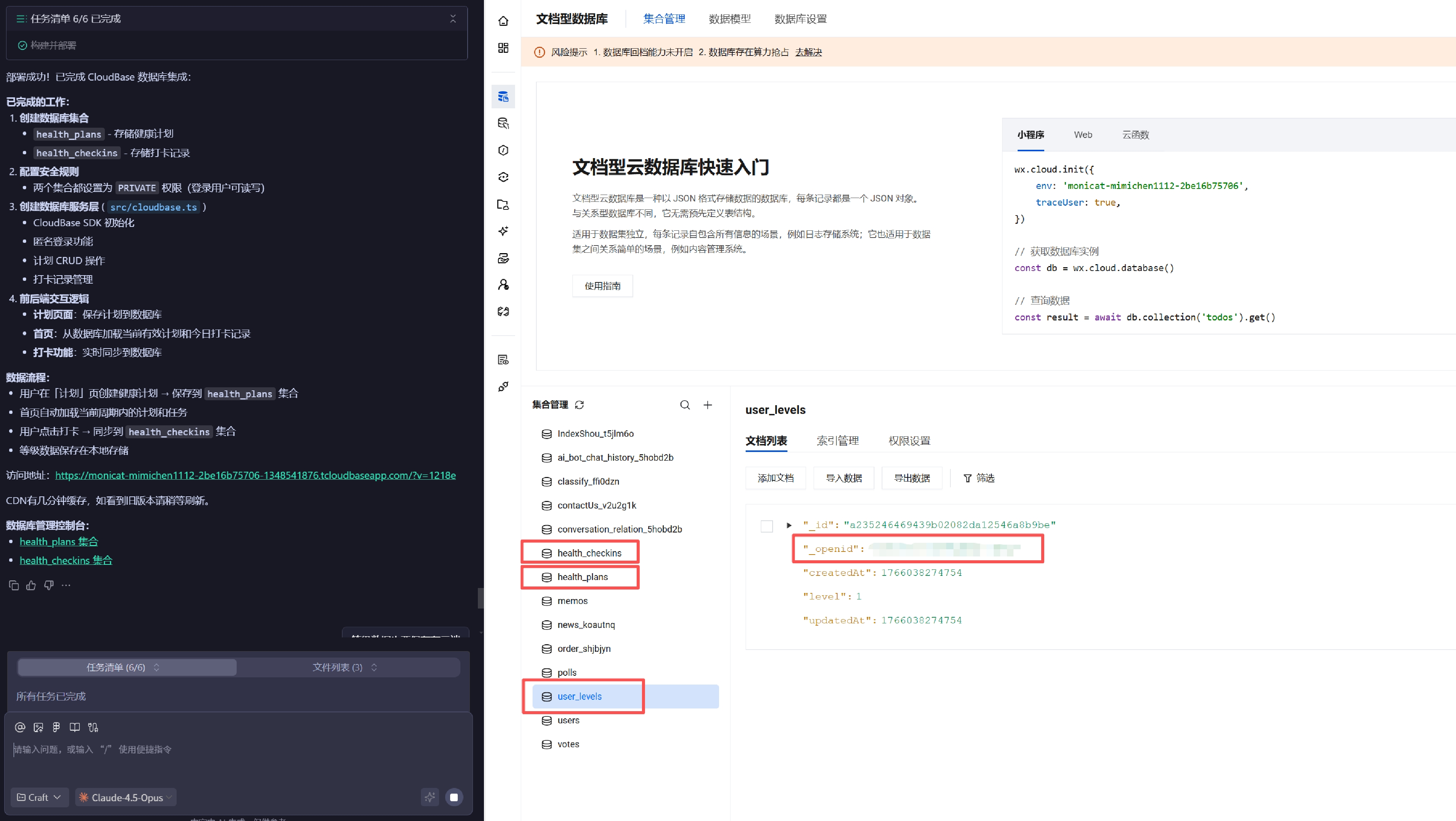 在CloudBase数据库创建数据表,记录用户的健康计划和打卡进度,完成前后端交互逻辑。