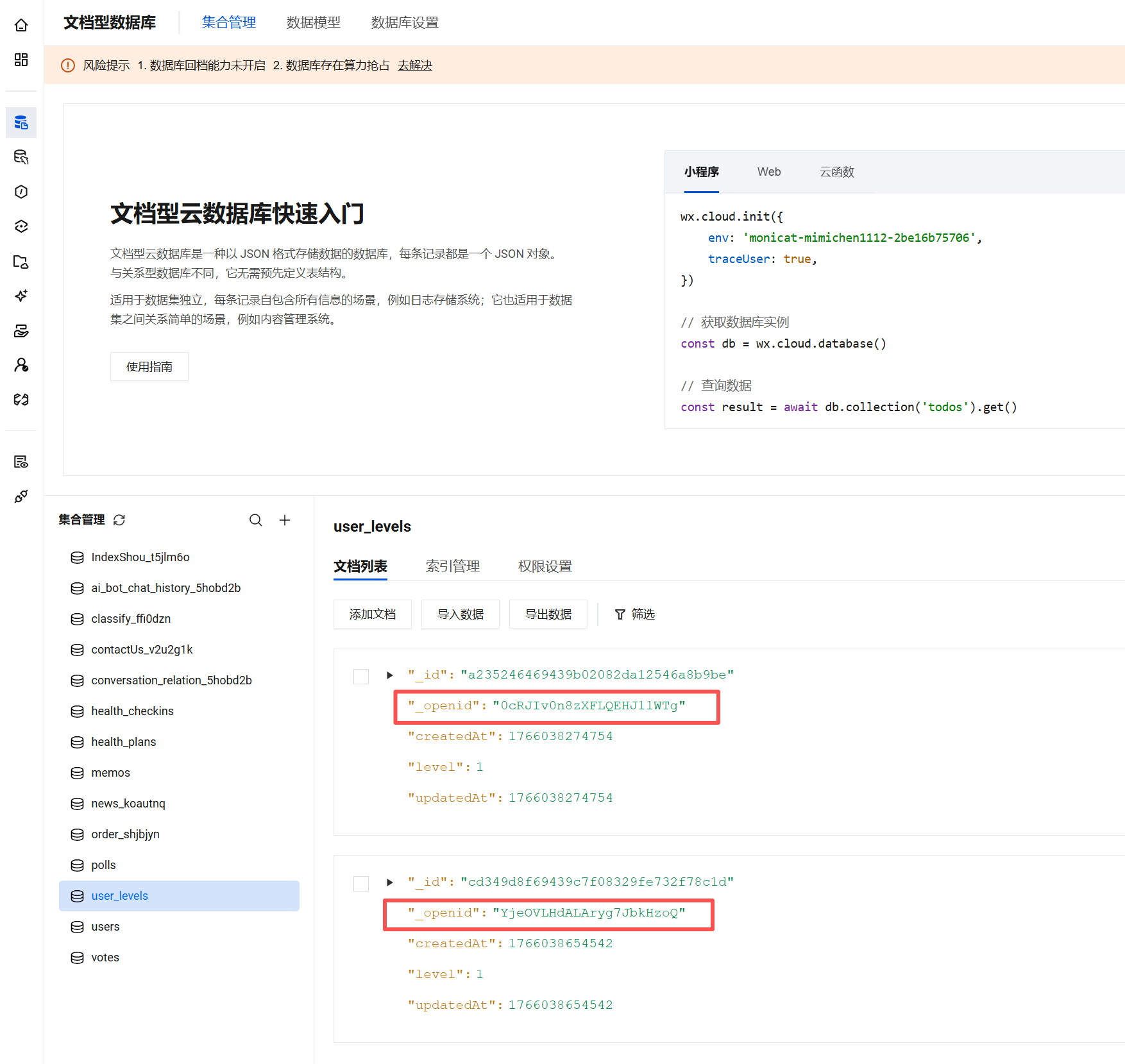 匿名登录无需创建登录页,登录认证过程用户无感知,可以提高应用便利性和用户留存。CloudBase会自动为每位匿名访问的用户生成唯一的 openid,从而实现数据的自然隔离。下图展示了两个独立设备产生的数据记录,其 openid完全不同。