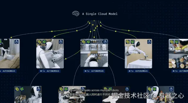 在 SOP 架构下,不再是一台机器人在苦苦探索,而是多台机器人组成集群,共享同一个 VLA 策略。
