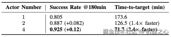 在严格限制总训练时长为 3 小时的前提下,四机并行学习的最终成功率达到了 92.5%,比单机提升了 12%。更关键的是,SOP 成功将硬件的扩展转化为了学习时长的极致压缩。要达到 80% 的性能基准线,单机苦练需要 174 分钟,而四机战队仅需 72 分钟,训练速度达到原来的 2.4 倍。