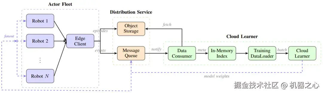 系统采用了先进的 Actor-Learner 分离架构,通过消息队列完全解耦了数据生产与消费。这意味着系统具备了「零配置」的弹性水平扩展能力:新的机器人加入集群无需修改任何代码或停机配置,只需连接消息队列即可即插即用,自动分担数据采集任务。