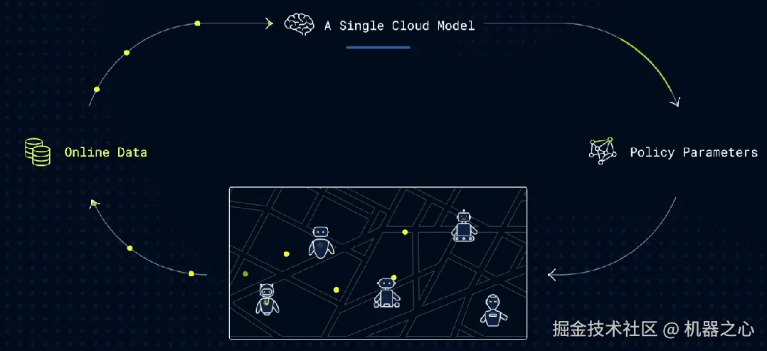 这种空间上的并行,大幅拓宽了真实世界中状态 - 动作分布的覆盖面,让系统能瞬间接触到极其广泛的场景,直接避开了单机学习容易陷入的局部瓶颈。