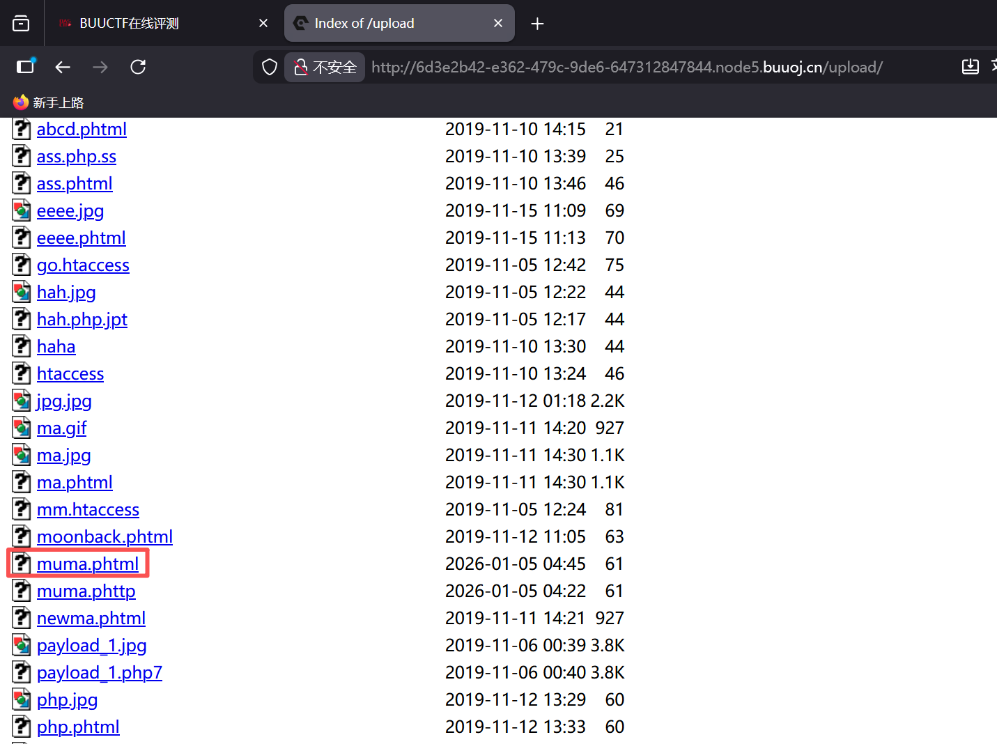 http://6d3e2b42-e362-479c-9de6-647312847844.node5.buuoj.cn/upload/muma.phtml