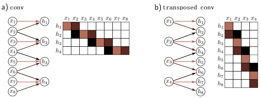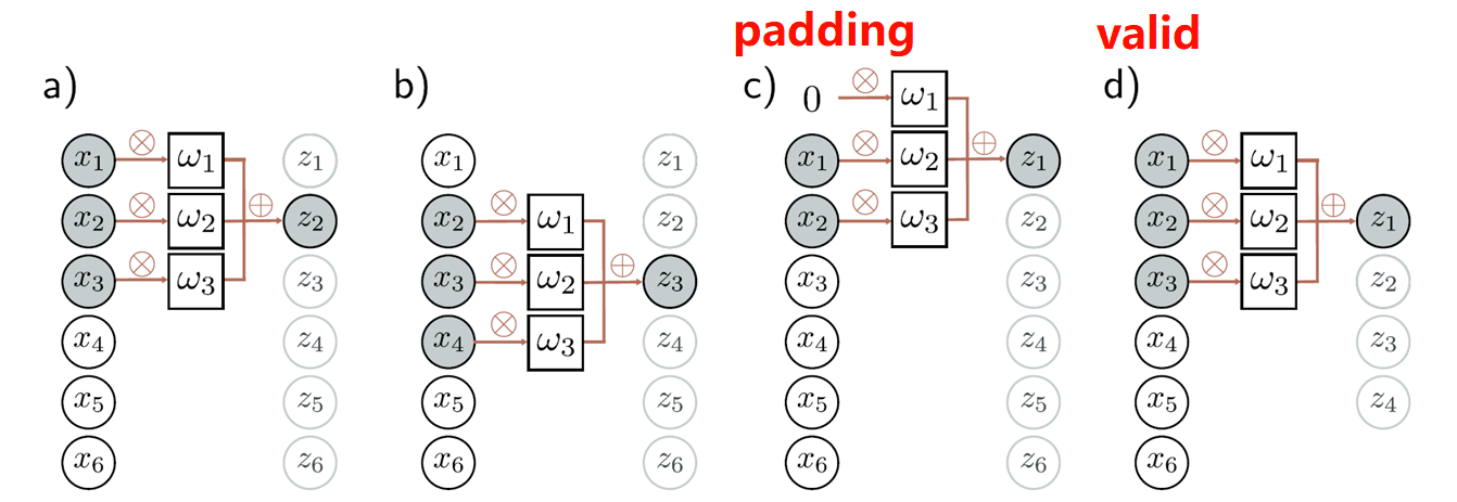 h i = a [ β + ω 1 x i − 1 + ω 2 x i + ω 3 x i + 1 ] = a [ β + ∑ j = 1 3 ω j x i + j − 2 ] \begin{aligned} h_i &= \mathrm{a}\left[\beta + \omega_1 x_{i-1} + \omega_2 x_i + \omega_3 x_{i+1}\right] \\ &= \mathrm{a}\left[\beta + \sum_{j=1}^{3} \omega_j x_{i+j-2}\right] \end{aligned} hi=a[β+ω1xi−1+ω2xi+ω3xi+1]=a[β+j=1∑3ωjxi+j−2]
