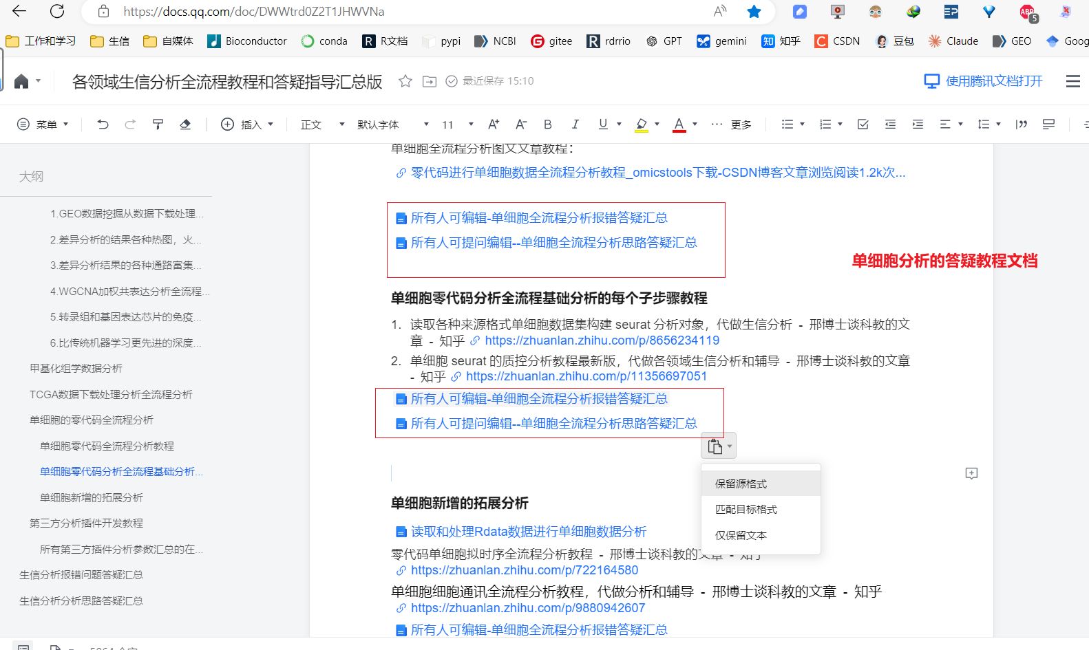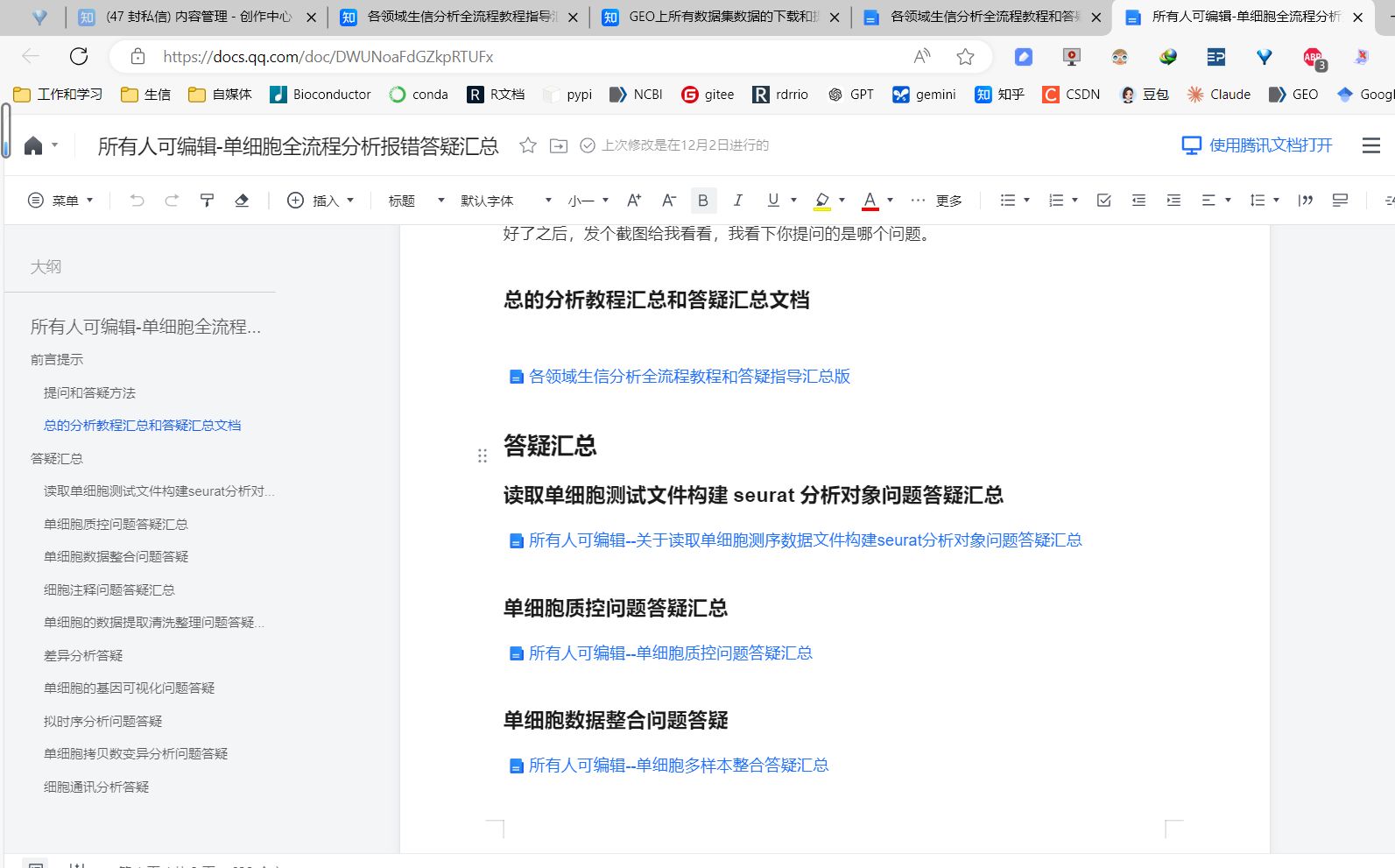 这篇总的腾讯文档是各领域生信分析答疑指导汇总文档的入口,以后所有的生信分析教程资料都在这个在线word文档中就能检索到,答疑汇总也能在这个word文档中检索到,都在这个在线word文档对应的提问答疑文档文件中提问,提问的问题在文档中用红色字体显示,我答疑在文档中用黑色字体显示,提问答个疑的文档和教程的文档所有人都可编辑。大家在腾讯文档里提问好了之后,现在答疑文档也是比较多的,发个截图和答疑文档的链接网址给我看看,这样我能快速定位到你提问的是哪个问题。
