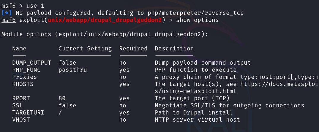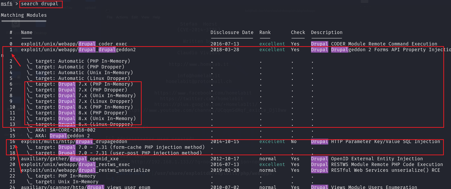 根据信息收集发现使用的是 Drupal 内容管理系统。使用 msf 查看是否有该框架的漏洞信息。发现 1 和16都可以使用。