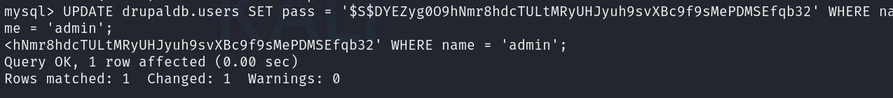 UPDATE drupaldb.users SET pass = '$S$DYEZyg0O9hNmr8hdcTULtMRyUHJyuh9svXBc9f9sMePDMSEfqb32' WHERE name = 'admin';