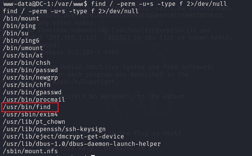 find :用来在系统中查找文件。同时,它也有执行命令的能力。如果 find 配置为使用 SUID 权限运行,则可以通过 find 执行的命令都将以 root 身份去运行