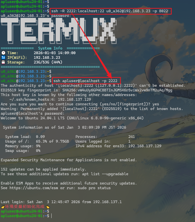 从而可以在 Termux 上使用 ssh -p 2222 localhost反向登录回 VM,实现 SSH 切换。