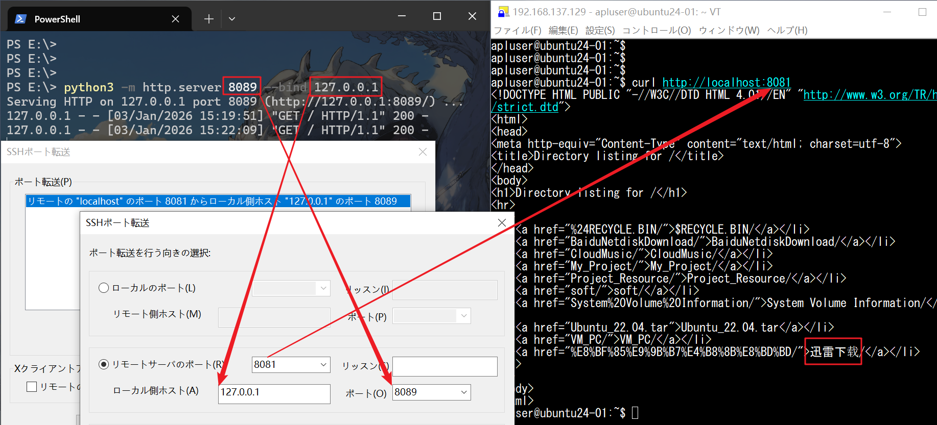 ⏹本地电脑开启了python服务,然后通过TeraTerm连接vm虚拟机之后,进行远程端口转发。设置完之后就可以在vm虚拟机中访问本地电脑提供的服务了。