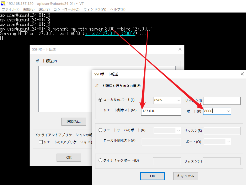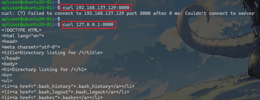 apluser@ubuntu24-01:~$ python3 -m http.server 8000 --bind 127.0.0.1