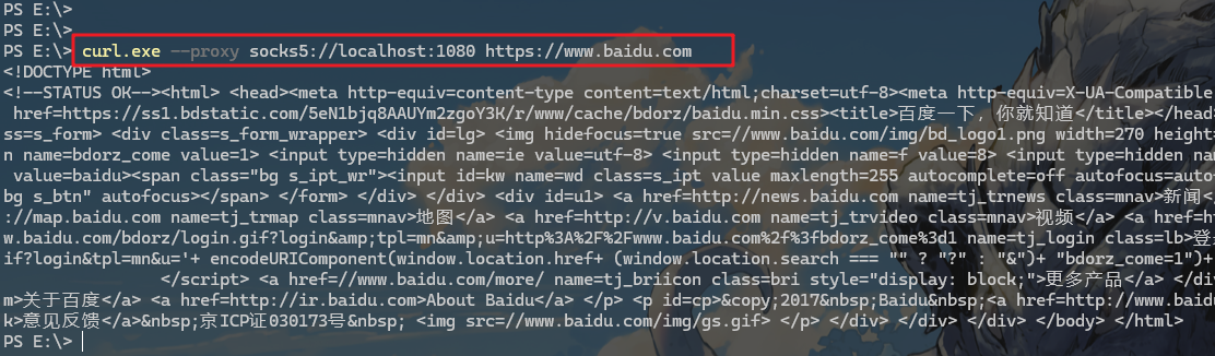 curl.exe --proxy socks5://localhost:1080 https://www.baidu.com- 在powershell中,