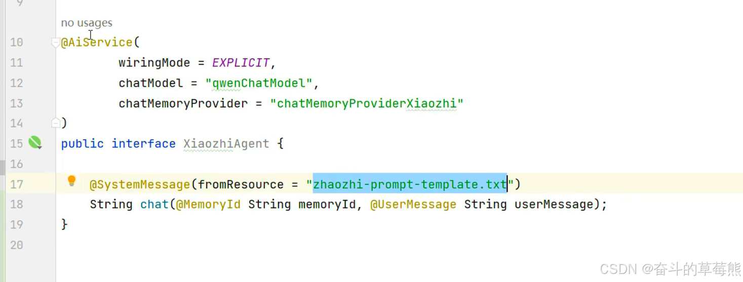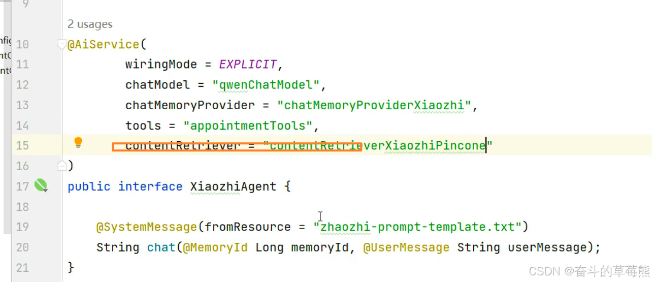 流程梳理:AIService中注解定义好对应的指定模型,聊天记忆。聊天基于通过单独写一个Bean自动注入,外部使用直接调用这个Aiserivice就可以实现聊天记忆