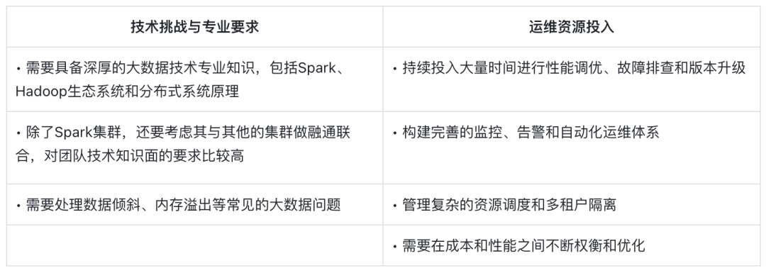 **对于大多数组织而言,关键问题不是"我们能否维护 Spark",而是"维护 Spark 是否是最有价值的资源投入"。**如果业务和数据资源的分析利用是企业核心竞争力,那么花费大量精力维护一整天 Spark + 生态系统是否是最佳的选择?选择托管服务或更自动化的替代方案可能更为明智,让宝贵的工程资源专注于业务创新而非基础设施维护。