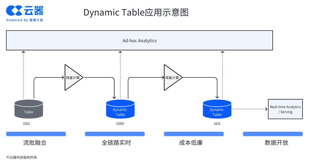 相比之下,笔者主张"流批融合"的方案。它依托新的增量计算技术实现,让同一套代码逻辑无缝适配批处理和流处理,避免了 Lambda 架构的割裂。以云器Lakehouse 的通用增量计算为例,它支持标准 SQL 的完整语义,允许开发者将传统批处理任务通过简单调整(如将 INSERT OVERWRITE 改为 CREATE DYNAMIC TABLE)转为分钟级增量处理。