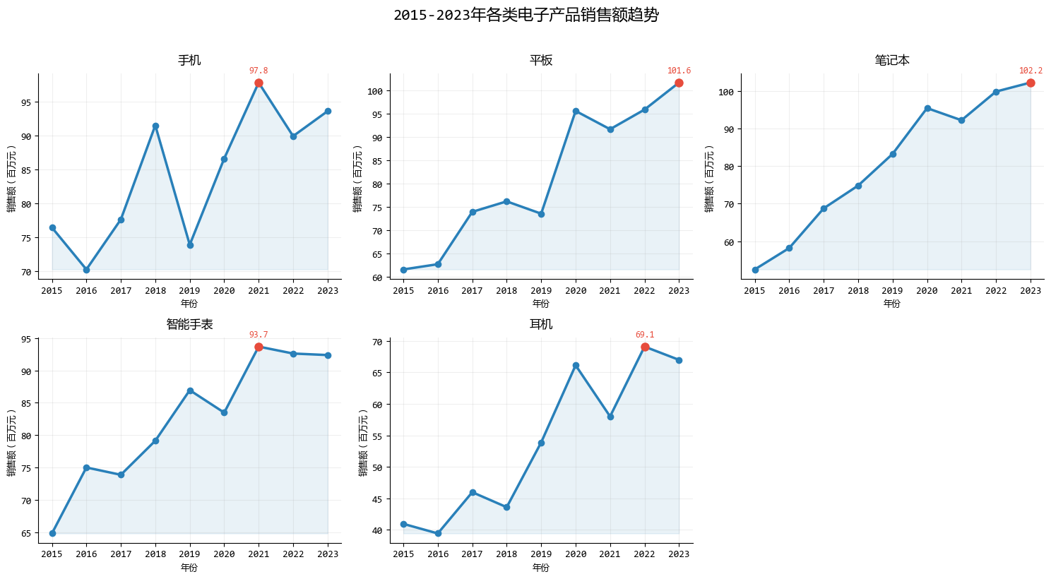 ax.plot(years[max_idx], sales[max_idx], 'o', color='#E74C3C', markersize=8)