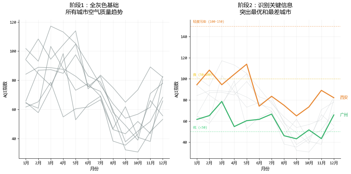 ax1.plot(months, aqi_data[city], color="#7F8C8D", linewidth=1.5, alpha=0.6)  # 灰色