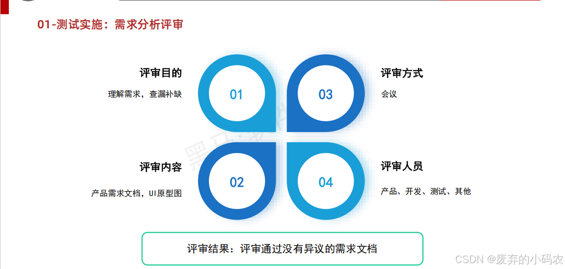 前置:阅读需求 1、正常情况下阅读所有需求 2、涉及到本项目测试人员全部参与 目标: 1、熟悉项目核心功能及业务 2、站在不同角度对需求进行查漏补缺 3、各部门对需求理解一致【重要】 评审人员:产品、开发、测试 -