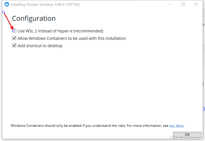 4、安装:安装时的关键配置:取消勾选 "Use the WSL 2 based engine"(这是适配 WSL 1 的核心,若勾选会因 CPU 不支持而安装失败 / 启动异常)。
