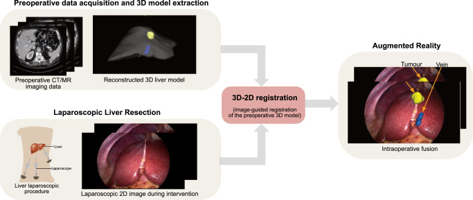 图1.腹腔镜图像与术前3D CT或MR扫描融合。首先使用术前3D扫描重建肝脏边界、肿瘤和对安全手术至关重要的主要血管。在腹腔镜手术过程中,我们使用图像配准将重建的模型(此处为3D网格)叠加到2D肝脏视图上。目的是将3D网格点投影到肝脏边界上,从而能够理解肿瘤和血管的空间位置以及3D模型中匹配的肝脏边界。这种增强现实技术有助于外科医生在手术中定位肿瘤和重要地标。上述结果是使用Koo等人(2017)的半自动方法获得的。