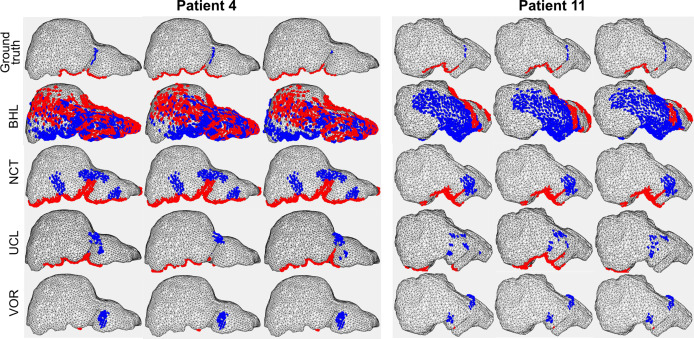 图73D地标分割任务的定性结果:第一行显示了两名测试患者的真值(GT)地标,后续行显示了各团队的预测结果。肝下缘地标显示为红色,镰状韧带地标显示为蓝色。