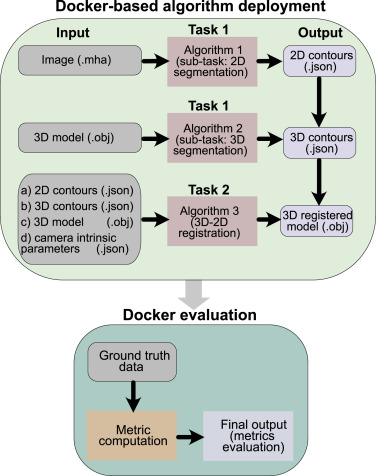 图4. P2ILF团队挑战赛的提交流程:在Grand Challenge平台上建立了基于Docker容器的提交系统。向挑战参与者提供了每个肝脏模型及其对应的图像以及相机内参。算法提交需要不同的输入,用于预测2D肝脏地标、3D肝脏地标,以及利用这些地标和相机内参将3D模型配准到腹腔镜图像。最后,使用不同的指标评估每个团队算法的输出(更多详情请参阅"评估指标"部分)。