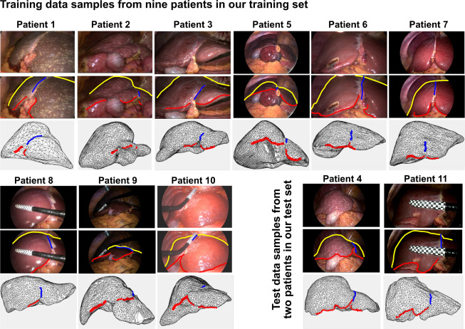 图3.P2ILF数据集:提供包含原始腹腔镜图像、标注的解剖地标(轮廓线为黄色,肝下缘为红色,镰状韧带为蓝色),以及手动对齐的3D肝脏模型中对应的3D解剖标注(肝下缘为红色,镰状韧带为蓝色)的训练和测试数据样本。该数据集共包含11名患者,其中9名用于训练,2名用于测试。