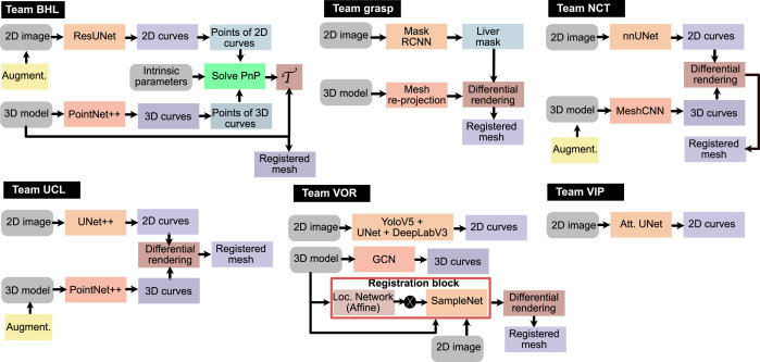 图5.六个团队方法的通用流程。BHL团队:首先对输入的2D图像和3D模型进行预处理和增强。使用两个ResUNet对图像中的2D地标进行分割,使用一个PointNet++对术前3D模型中的3D地标进行分割。为了执行3D术前网格到2D腹腔镜图像的配准,将对应关系输入到PnP算法中,并获得变换矩阵。GRASP团队:使用Mask-RCNN生成肝脏的2D掩模,然后通过可微分渲染最小化轮廓重投影误差来执行3D术前网格到2D腹腔镜图像的配准。NCT团队:分别使用nnUNet和MeshCNN分割2D和3D地标。然后使用可微分渲染,通过最小化先前分割地标的重投影误差来执行术前3D网格到2D腹腔镜图像的配准。UCL团队:使用UNet++分割2D地标,同时使用PointNet++分割3D地标。该团队还使用可微分渲染进行图像配准。VOR团队:2D情况被视为像素分割任务,3D情况被视为顶点分类任务。然后使用可微分渲染,通过由定位网络计算的仿射变换生成2D图像来执行3D术前到2D腹腔镜图像的配准。形状正则化项提供额外监督以避免不希望的网格变形。VIP团队:该团队仅参与了任务1。使用Attention UNet进行腹腔镜图像中肝脏解剖地标的像素分割任务。