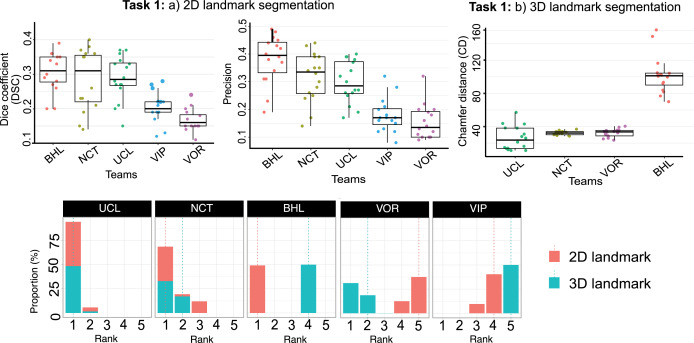 图10任务1的团队排名:使用Dice相似系数和精确率对2D地标分割任务进行排名。对于3D地标分割任务,我们使用了肝下缘和镰状韧带之间(如果可用)的平均3D Chamfer距离。我们对两个子任务都采用了聚合和排名策略。底部提供了每个团队测试案例比例的排名。