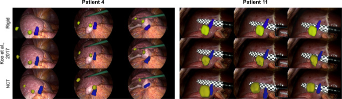 图9AR与基线方法的比较:AR图像由任务2的配准结果生成,并与Koo等人(2017)的基线方法进行比较。由于NCT团队取得了如图8所示的一致结果,我们只将其与基线方法进行比较。肿瘤显示为黄色,下腔静脉显示为蓝色。