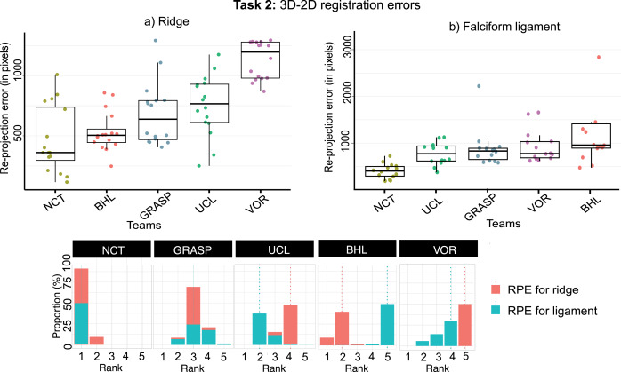 图11任务2的团队排名:分别使用3D-2D配准量化的重投影误差(RPE)进行评估------(a) 针对肝下缘和 (b) 针对镰状韧带。我们对每个子任务都采用了先聚合再排名的策略。底部提供了每个团队测试案例比例的排名。